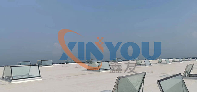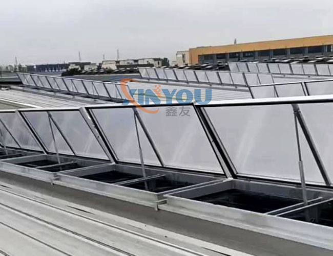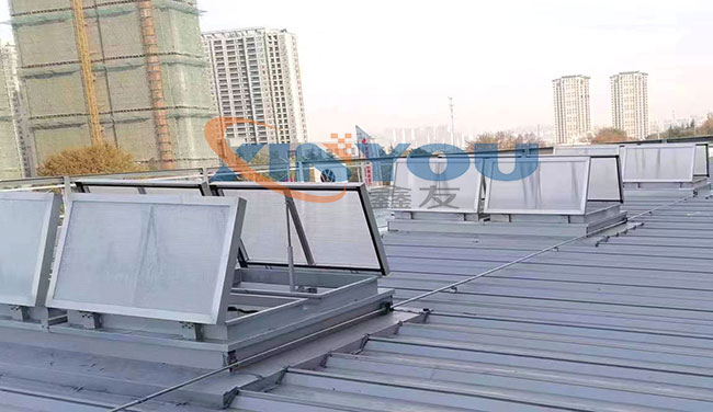 鑫友工業(yè)類電動消防排煙天窗主要適用于廠房等工業(yè)類大型建筑的屋頂采光、通風(fēng)、排煙,設(shè)計依據(jù)建筑標(biāo)準(zhǔn)設(shè)計圖集09J621-2。