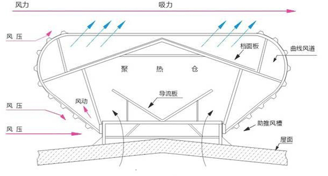 風(fēng)壓作用:當(dāng)風(fēng)從廠房頂部吹過(guò),迎風(fēng)面產(chǎn)生氣壓區(qū),背風(fēng)面產(chǎn)生負(fù)壓區(qū),氣壓的相互作用,使廠房達(dá)到通風(fēng)換氣的目的。